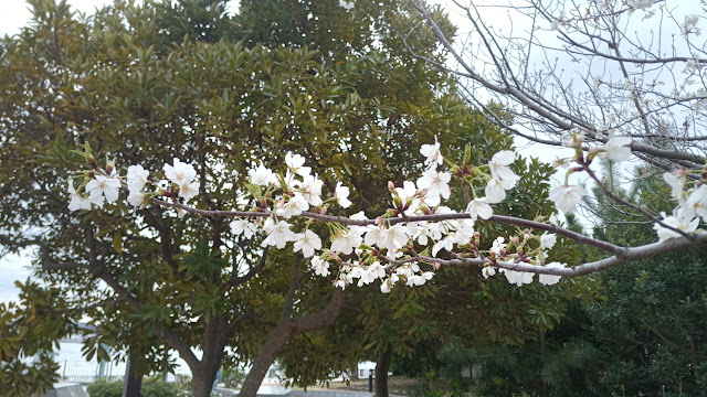 最初に江ノ島の広場のソメイヨシノです。ほぼ満開でした。しかし今日は曇りで青い空ではないので桜の花が映えません。